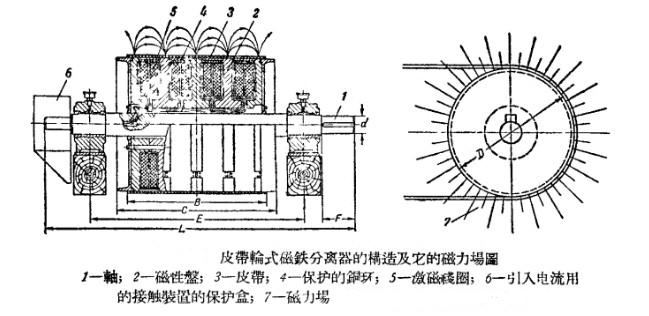 在皮帶輪式分離器內(nèi),沿著輪子的轉(zhuǎn)動其表面會產(chǎn)生強大的磁場,在較小直徑處的磁場達到750-900奧斯特,較大直徑處磁場達到1200-1400奧斯特,當(dāng)即將進行球磨機粉碎的物料內(nèi)金屬塊落到這個磁場時,就會被吸進并貼在筒上,然后脫落而被皮帶擲落到分離器下方的特殊卸斗內(nèi)。其具體結(jié)構(gòu)如圖: