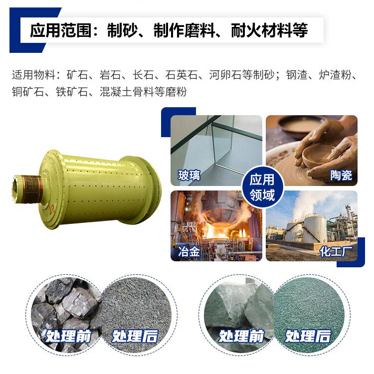 棒磨機(jī)廣泛用于金屬和非金屬礦山及水利.建材部門(mén)粉磨各種礦石或巖石。